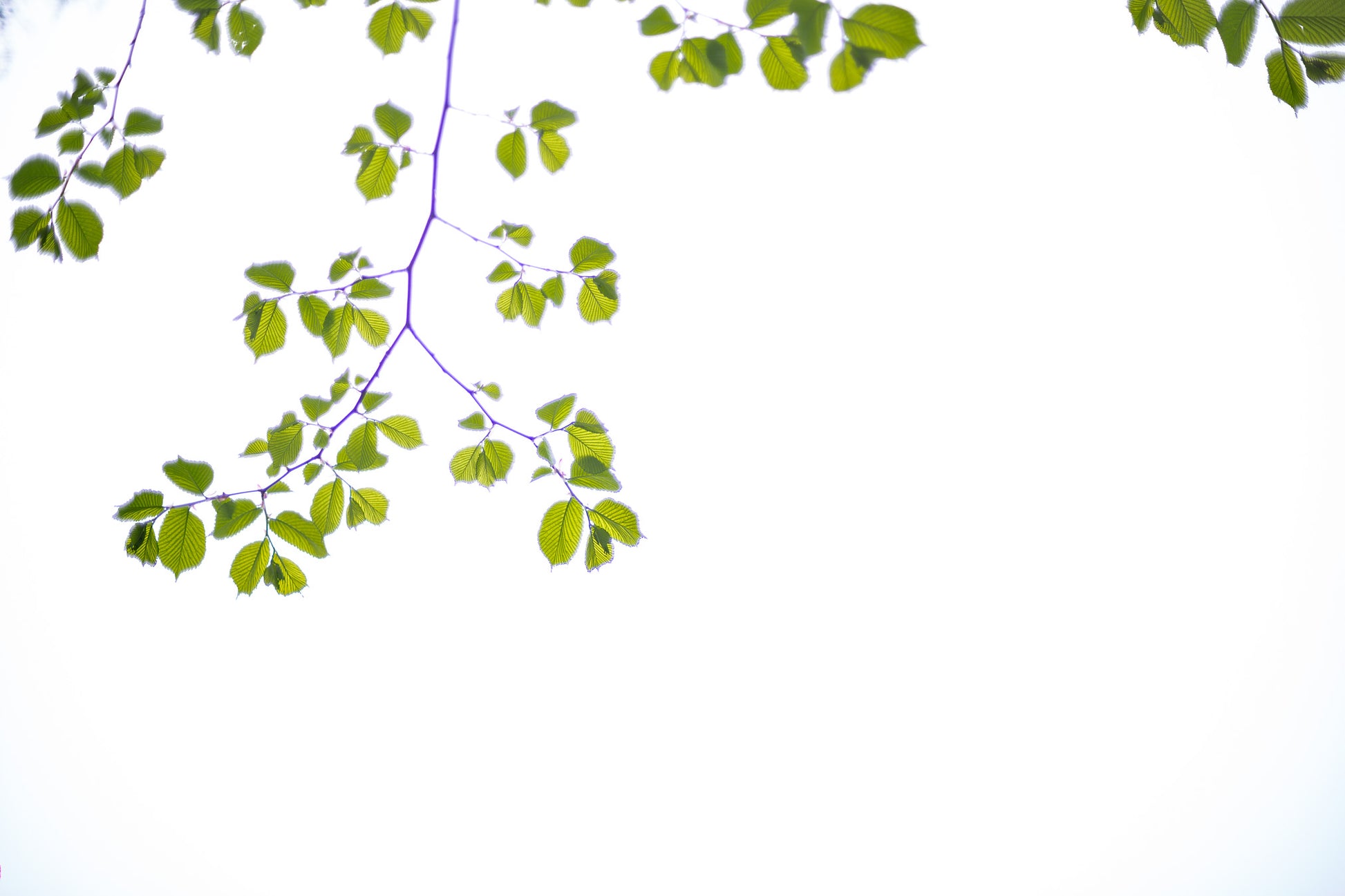 Zarte, frische Buchenblätter erstrecken sich filigran von einem feinen Ast ins Bild. Das leuchtende Grün der Blätter kontrastiert mit dem fast weißen, überbelichteten Himmel im Hintergrund. Die Blattadern sind deutlich sichtbar und betonen die natürliche Struktur des Blätterwerks. Die sanfte Unschärfe in den Ecken verleiht dem Bild eine weiche, fast minimalistische Anmutung. Der Fokus liegt auf der Leichtigkeit der Natur und der harmonischen Verbindung zwischen Licht und Transparenz.