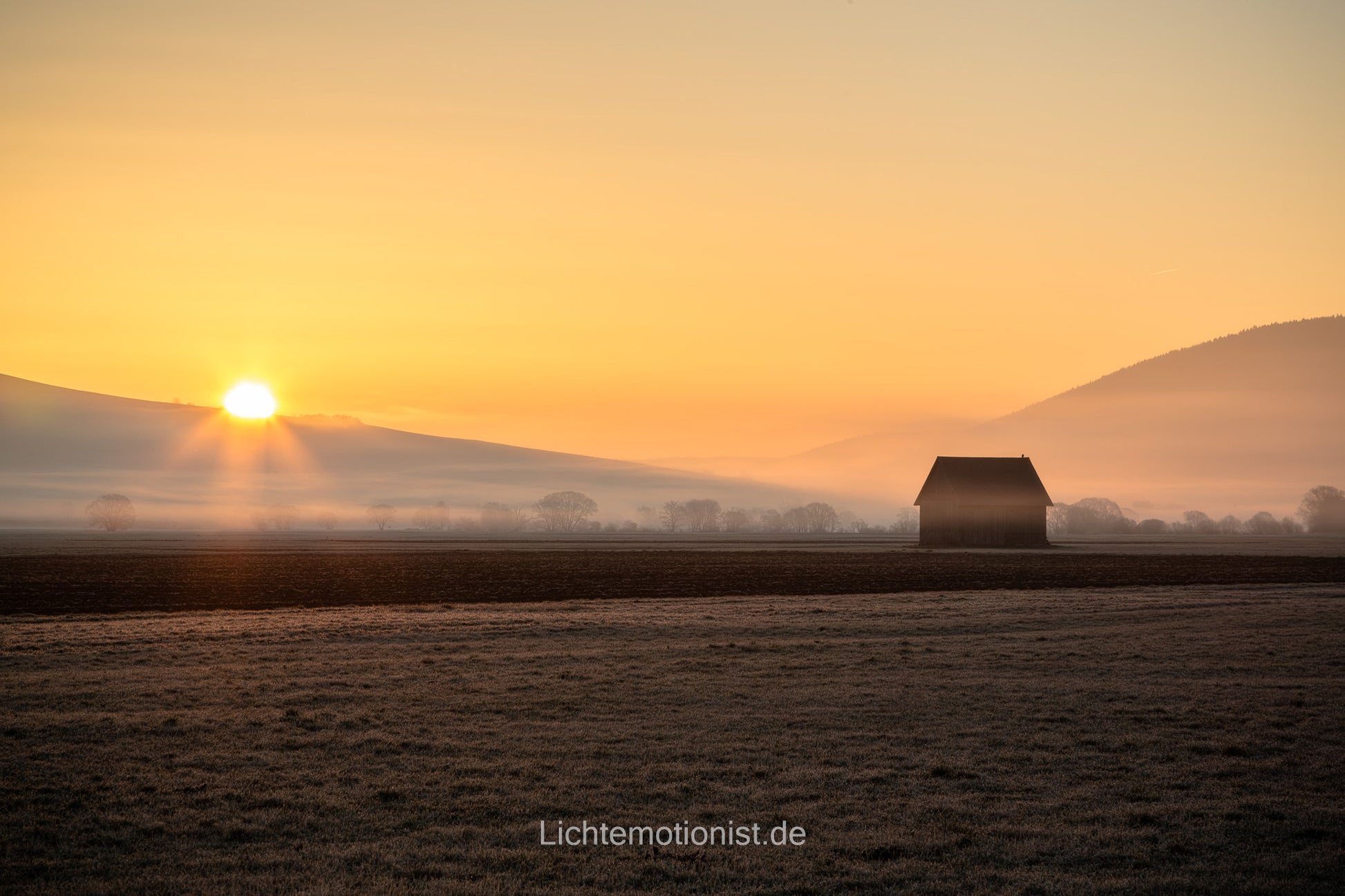 Im Vordergrund erstrecken sich weite Felder, die in einem sanften Nebel gehüllt sind. Die verschwommenen Umrisse von Bäumen tauchen geheimnisvoll durch den Nebel auf, ihre Silhouetten scheinen fast mystisch in der kühlen Morgenluft. Eine einsame Hütte steht mitten in den Feldern und wirkt wie ein stiller Beobachter der ruhigen Landschaft. Im Hintergrund erheben sich sanfte Hügel, die von den ersten Strahlen der aufgehenden Sonne in warmes Licht getaucht werden. Die Kombination aus Nebel, Silhouetten und dem frühen Sonnenaufgang schafft eine ruhige und fast magische Atmosphäre, die den Moment der Dämmerung in seiner vollen Pracht einfängt.