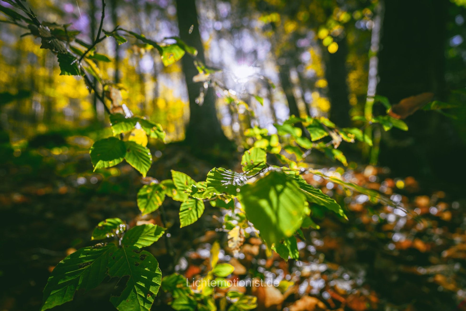 Sanftes Licht durchdringt den Herbstwald, beleuchtet Blätter in sattem Grün und schafft eine ruhige, natürliche Atmosphäre.