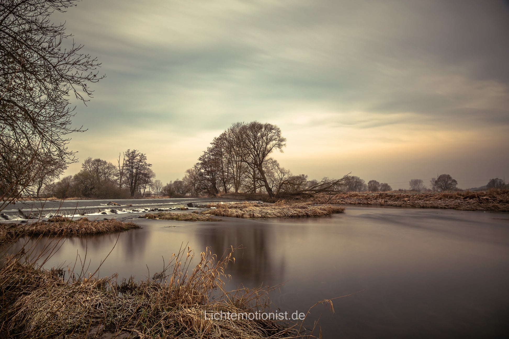 Das Bild zieht den Betrachter mit seiner düsteren und zugleich faszinierenden Atmosphäre in den Bann. Im Vordergrund dominieren verwelkte Gräser, deren detailreiche Strukturen dem Bild Tiefe und eine melancholische Stimmung verleihen. Das Flussufer erstreckt sich in ein sanftes, ruhiges Gewässer, das wie ein stiller Spiegel wirkt. Im Hintergrund tauchen weitere verwelkte Pflanzen und kahle Bäume auf, die die karge und melancholische Szenerie unterstreichen. Die gesamte Komposition ist in braunen und gedeckten Farben gehalten, was die düstere, fast mystische Ausstrahlung des Bildes verstärkt. Ein zeitloser Augenblick, der die Vergänglichkeit und Stille der kalten Jahreszeit eindrucksvoll vermittelt.